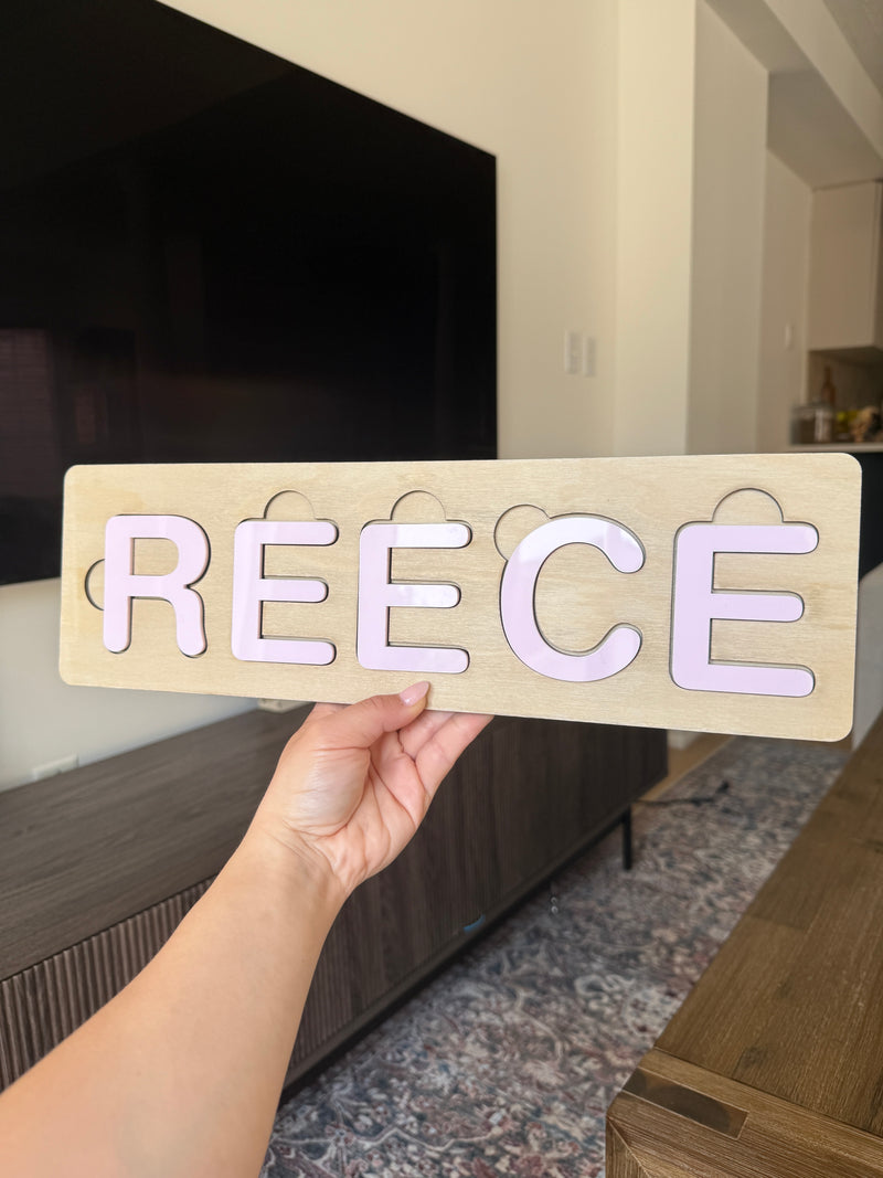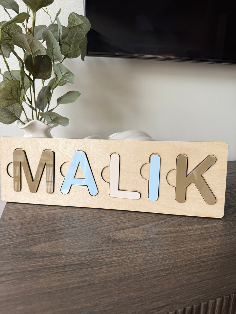Made from wood and colourful acrylic, each puzzle is crafted with care and customized with your child’s name.